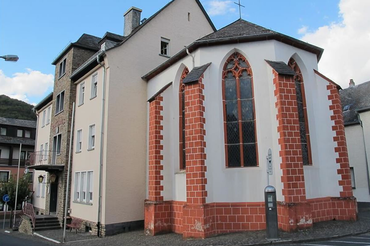 Als Anbau des Rathauses blieb der Chor der ehemaligen Pfarrkirche St. Katharina erhalten. Die Kirche in 1945 zerstört wurde. 1353 wird eine Kirche zu Treis erwähnt unter dem Patrozinium des hl. Kastor und nach Karden inkorporiert. Der Bau, von dem die heutige Gedächtniskapelle den Chor bildete, ist im 15. Jh.